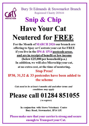 Please see details of our latest neutering scheme and updated postcode areas. We are now including IP30,IP31, IP32 and IP33 in the scheme!