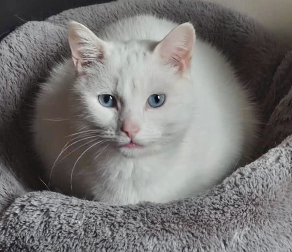 Snowy with his beautiful blue eyes (now 3+ years) came into our care with his older housemate Lucky (8+ years), as their owner was moving and could not take them to the new home. Both cats were nervous initially in their new situation but have slowly been regaining their confidence and their fosterer can now stroke them. Snowy is the more sensitive and seems to rely on Lucky for security for now, but he has started to follow him for attention and has even settled on his foster Mum's lap to be close to lucky. We would like to find this handsome bonded pair a new home together, so Snowy can keep the friend that he will have known most of his life. Both cats would love a garden back, and may need a little time when they move but they are lovely, gentle cats, who we are sure will thrive again in a quiet home. They may also be well suited to a more outside (halfway house) home, with land and outside shelter, but we would want them to also have access to the family home, which is what they have always had. They just need the right family so they can finally settle again, so if you have lots of love and a little patience at first, please apply for this sweet pair!
