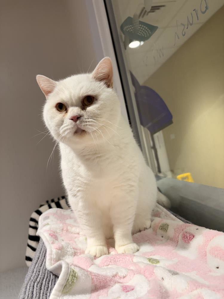 Hamish adores chin rubs and a good brush through his thick white hair and will roll around purring contently whilst you shower him with pets.