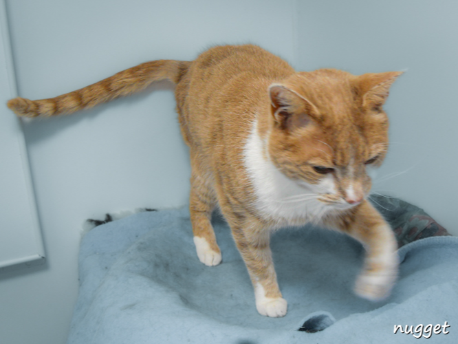 Nugget is a little timid at first but soon relaxes and enjoys attention and cuddles. A pensioner puss, he has had a dental and comes with a clean MOT. He doesn't ask for much, just a quiet loving home with somewhere warm to curl up and perhaps a garden to explore.