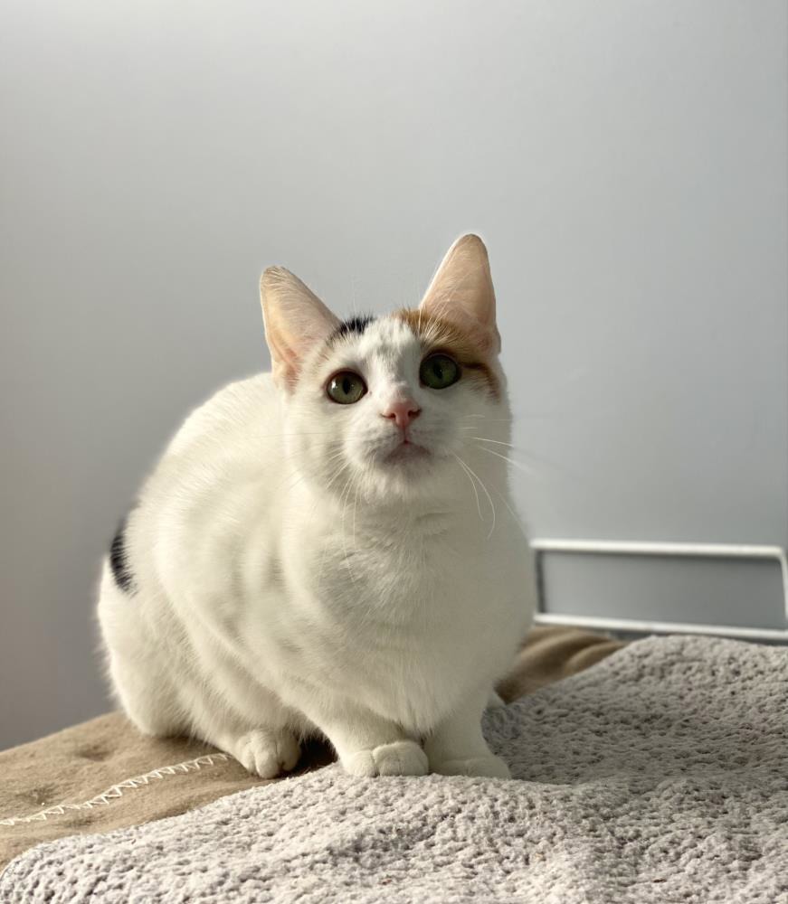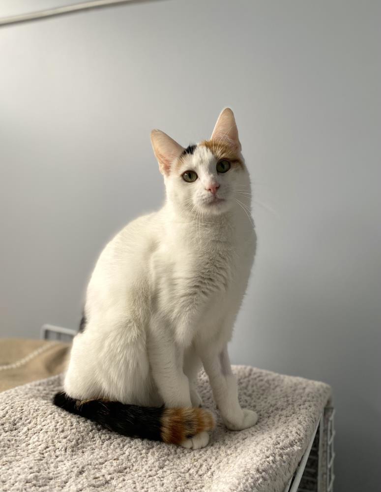 Lily (black) and Daisy (white-and tortie) are two sweet youngsters who came to us from a multi cat household, and their personalities reflect that early environment. They can be adopted together or separately, as they live amicably but don’t appear to be reliant on one another.