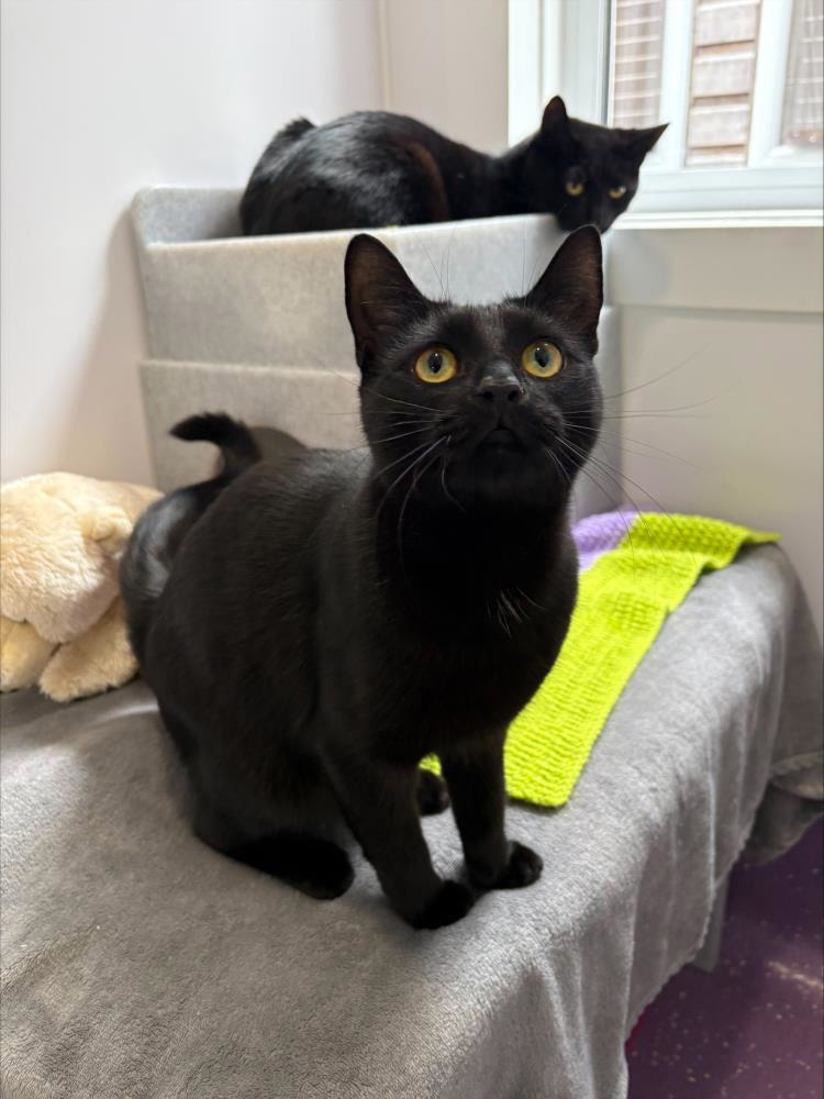 A change of family circumstances meant they came into our care. Rumi can be a little bit wary of strangers at first, however, in his previous home he would sit on a lap, sleep on the bed and loved to play with a mouse toy, balls and fishing rod toys. He would hide at first but then quickly warm up to cat sitters and visitors once having fuss/playing with them. Luna is the more confident out of the two of them. She enjoys playing with her mouse toy and balls, and she is very curious. She likes to sit on the windowsill and watch the world go by. Neither of them has experienced the outside world, so a garden for them to explore would be great enrichment for them both. Both like a fuss, and often sleep cuddled up on top of each other, with Rumi (the bigger of the two) using Luna as a pillow!