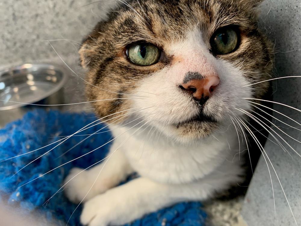 Otso came in to Cats Protection after living as a stray for a long time as a senior boy. For years he was fending for himself in all weathers, having to find his own food and shelter. Unfortunately his hardships have left both his ears crumpled with scar tissue, although he can still hear absolutely fine. As he felt safer Otso would start purring and stick his head out so that people can make a fuss of him. He absolutely loves to have his chin and cheeks rubbed, and will roll around and show his belly. After this ordeal Otso was homed 5 years ago to a lovely owner and was very well cared for, but unfortunately the owner’s health issues meant they were unable to continue to look after him. Otso is just shy of his 19th birthday, and we would love to find him another home for him to celebrate this milestone on a cosy sofa being pampered. He does have a heart murmur, something that is quite common in cats. He also has slightly high blood pressure, which is being treated with 1/2 a tablet once a day to keep it in a normal range successfully. He had bloods taken and a blood pressure check recently with the vet, and was a superstar at having both of these done, happily sat with his arm out patiently. He does have some early kidney disease so is on a renal diet. Due to his advanced age he does have some arthritis, which the previous owner found monthly solensia injections worked well for him to ease this.