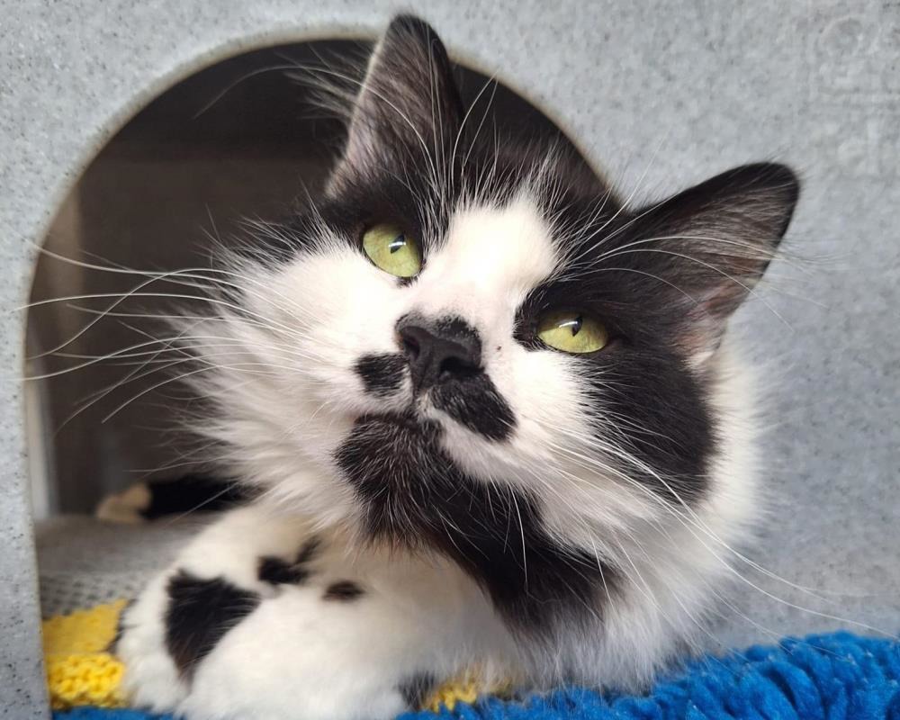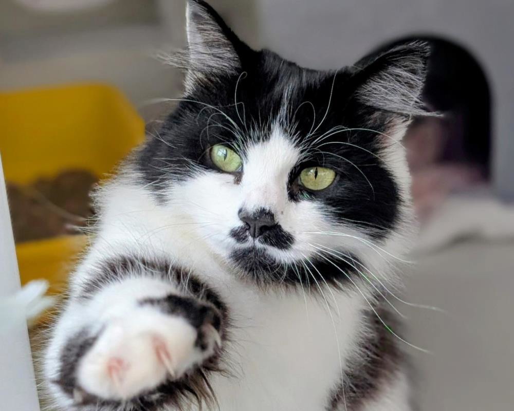 Ola is the most beautiful and friendly lady, one of the most affectionate cats you’ll ever have the pleasure of meeting. She is unique with her fluffy outfit, her alternating black and white toes and no tail, just a fluffy bobble!