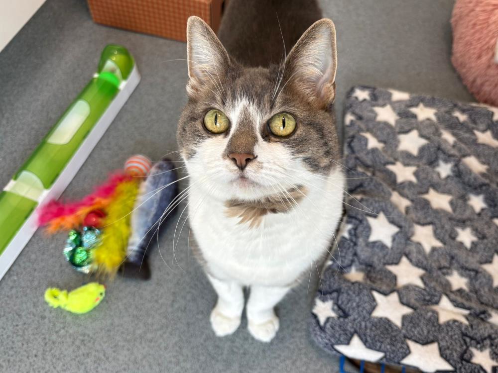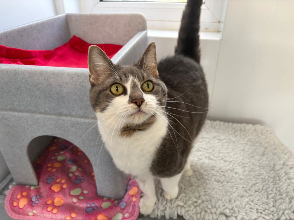 Meet Bongo, the lovely 12-year-old. Bongo had to be rehomed as her owners were moving and she had issues with the resident dog. Despite this, we think that Bongo would be able to be rehomed with a calm, cat-friendly dog in the future, pending a slow introduction. Bongo is used to outdoor access and despite her age still hunts and loves to play. Bongo loves a fuss and will greet you at the door of her pen and follow you around. Bongo has a grade 2 heart murmur, and this is something we can give you more information about at the centre. Bongo is a little bit wary of kids, so we think she would do best in a home with older children. If you would like to meet Bongo, please visit the centre during our opening hours.