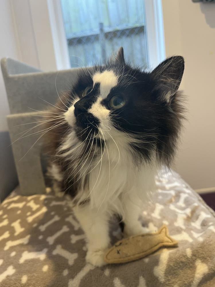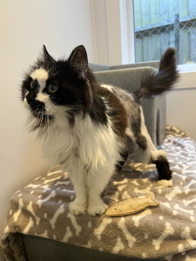 Cuddles is a beautiful 13-year-old black-and-white lady with a loving nature. After being sadly abandoned by her owner, she has been in our care for quite some time (due to being a microchipped stray) whilst we called, emailed and posted letters to the details on her microchip to try and find out more about her situation. Despite this being a confusing time for her, throughout it all she has been an absolute joy. True to her name, Cuddles is a devoted lap cat who simply adores affection. She’s a constant purr machine, always ready to curl up beside you for a fuss. She is confident, friendly, and thrives on human companionship, happily soaking up every bit of attention she can get. When Cuddles first arrived, her fur was heavily matted around her hips, which we believe may have contributed to some reduced muscle in this area. Since being shaved and cared for, she has shown wonderful improvement. She’s now moving much more freely, even jumping up and down from tables as she regains her strength now that she’s able to move her hips. Cuddles loves being pampered and brushed, and will happily sit and enjoy the attention for as long as you’re willing to give it. While we don’t know much about her past, her gentle and affectionate nature suggests she could potentially live happily with children and even dogs. However, she does love being the centre of attention, so we feel she may be happiest as the only cat in the home. If you’re looking for a loving, loyal companion who will reward you with endless purrs and cuddles, this special girl could be the perfect match.