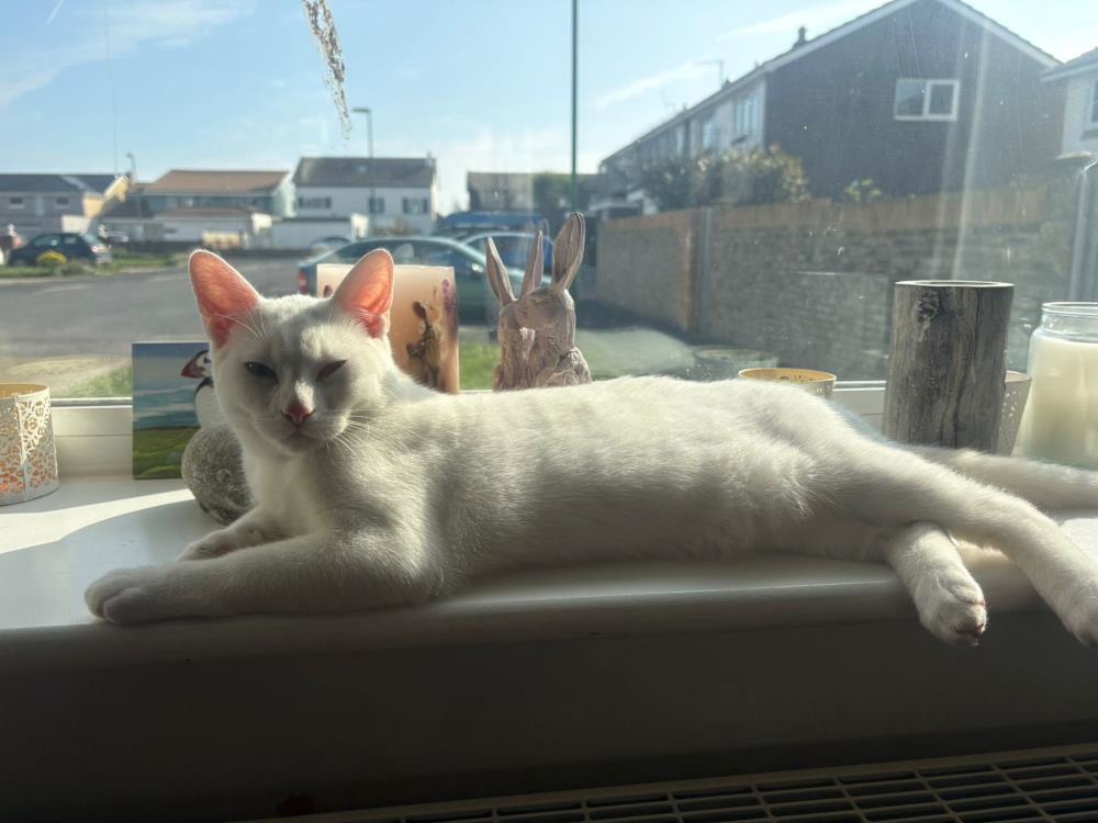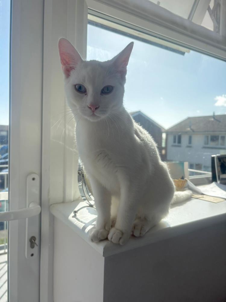 Meet the gorgeous Ziggy, approx 8 months old boy, with a sleek white coat and lean body. He is a very loving lad , enjoys a lot of attention and play interaction, plus a good cuddle-up when napping.