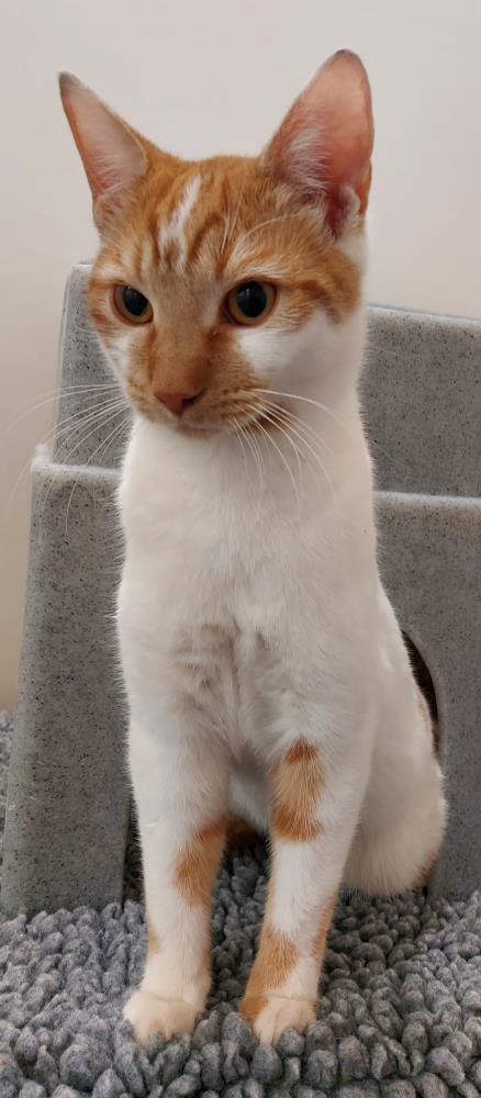 He has the most adorable spotty markings, a genuine ginger and white cow-cat!