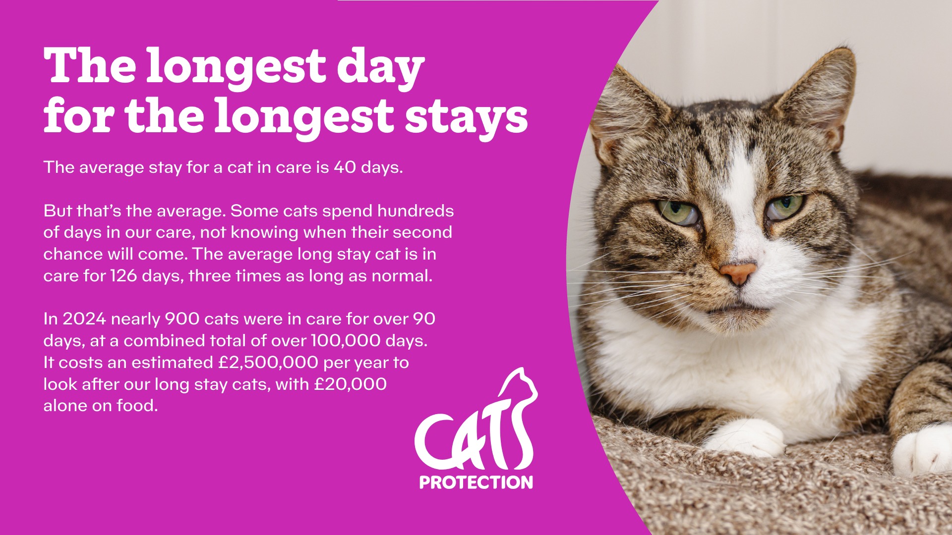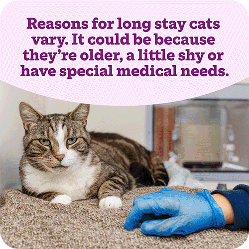 A brown tabby cat. Text says 'The average long stay cat spends three times longer in care than a typical cat.'